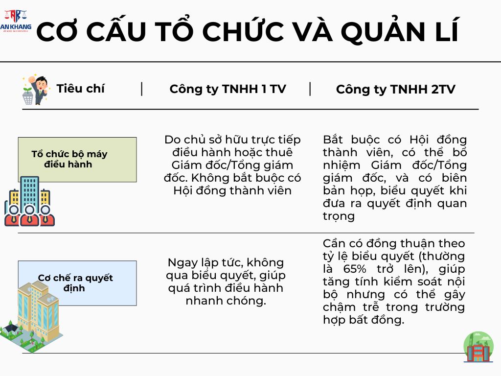 Cơ cấu quản lý của công ty TNHH 1 thành viên đơn giản, dễ vận hành nhưng có thể rủi ro nếu chủ sở hữu thiếu kinh nghiệm. Ngược lại, công ty 2 thành viên tuy phức tạp hơn nhưng lại đảm bảo tính minh bạch và kiểm soát nội bộ.
