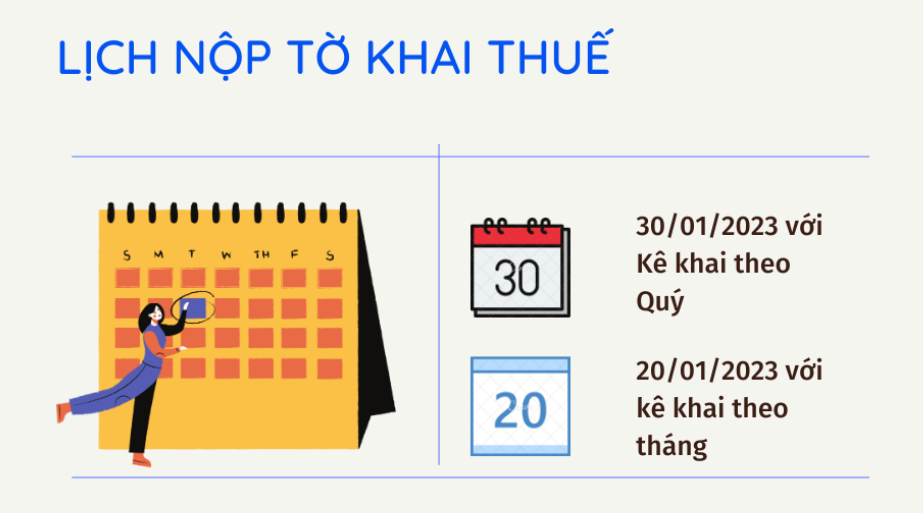 - Khai thuế tháng hoặc quý, tùy doanh thu;